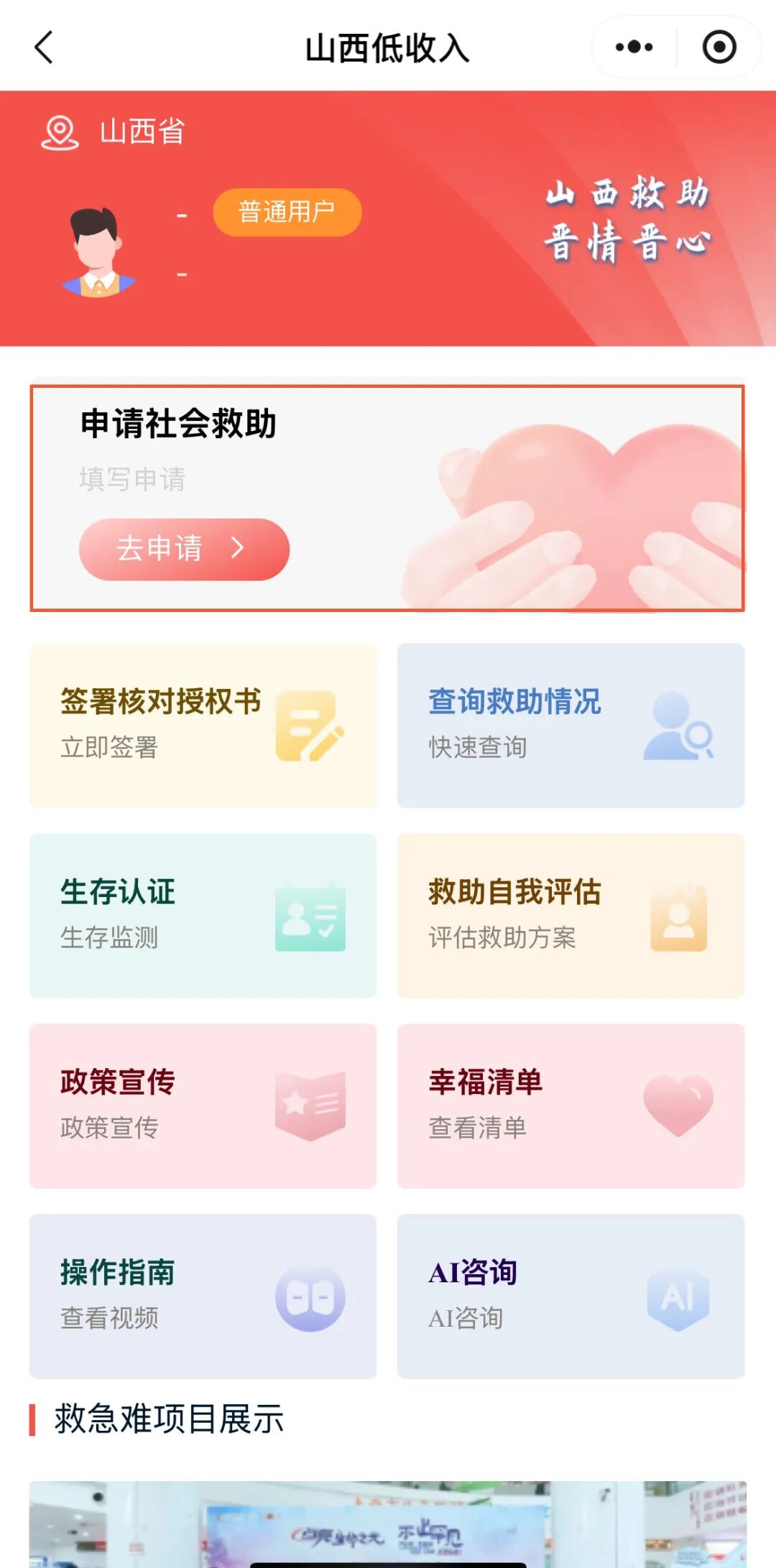 “晋心救”是山西省民政厅聚焦民生痛点、精准对接需求打造的线上社会救助服务平台,平台依托移动互联网技术,将城乡低保、特困人员供养、低保边缘家庭认定、支出型贫困家庭救助、因病致贫重病患者帮扶、临时救助等多项核心救助业务“搬”到掌上。无需堆积纸质材料,不用往返经办机构,指尖轻点就能完成申请全流程,让救助服务触手可及。